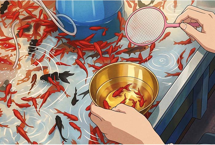 But Yatai are not just about eating! Half of the stalls are dedicated to nostalgic, slightly rigged carnival games. The most famous is “Kingyo-sukui” (Goldfish Scooping), where children and adults use a delicate paper net to catch live goldfish from a shallow pool before the paper melts and breaks.