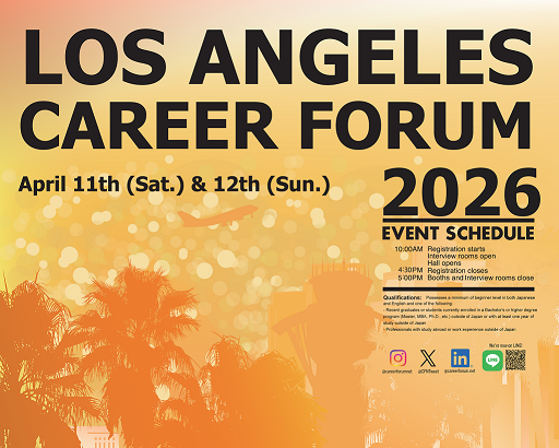 LOS ANGELES CAREER FORUM 2026 – A Job & Career Event for Japanese-English Bilinguals A career event for Japanese-English bilinguals featuring approximately 50 global companies, with opportunities to interview at company booths and potentially receive job offers. We also offer special programs to support your job search, including resume workshops, mock interviews, and case study workshops. For registration details and the event schedule, please visit the website. ◼︎Event Date & Venue